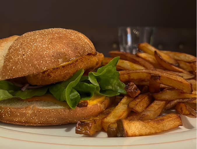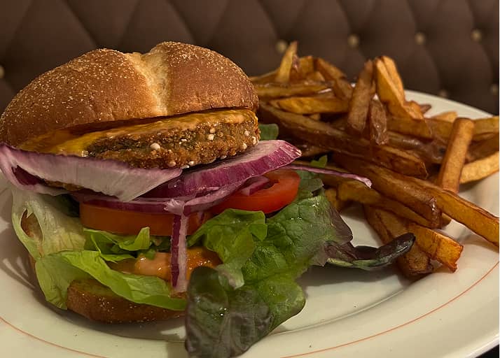 FritesSalad, tomato, onion, cheddar, veggie patty, cocktail sauce