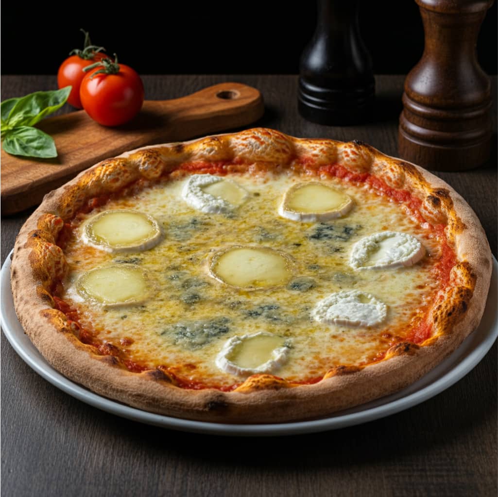 Tomato sauce / fresh cream, fresh goat cheese, gorgonzola, emmental, mozzarella
