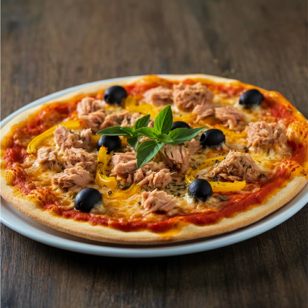Tomato sauce, pepper, tuna, cheese, olive, oregano