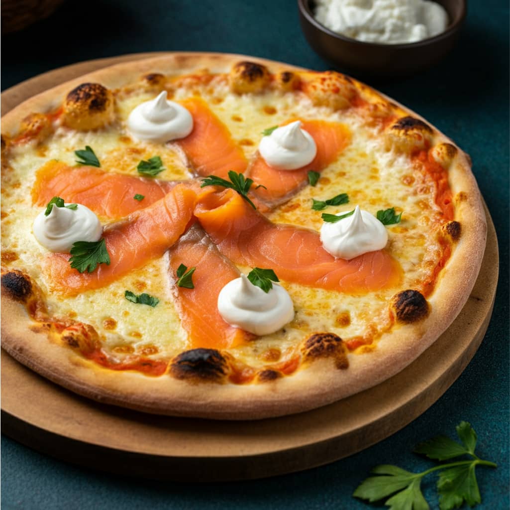 Tomato sauce / fresh cream, smoked salmon, garlic parsley, cheese