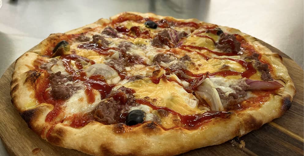 Tomato sauce, cheese, ground beef, cheddar, onion, barbecue sauce, olive