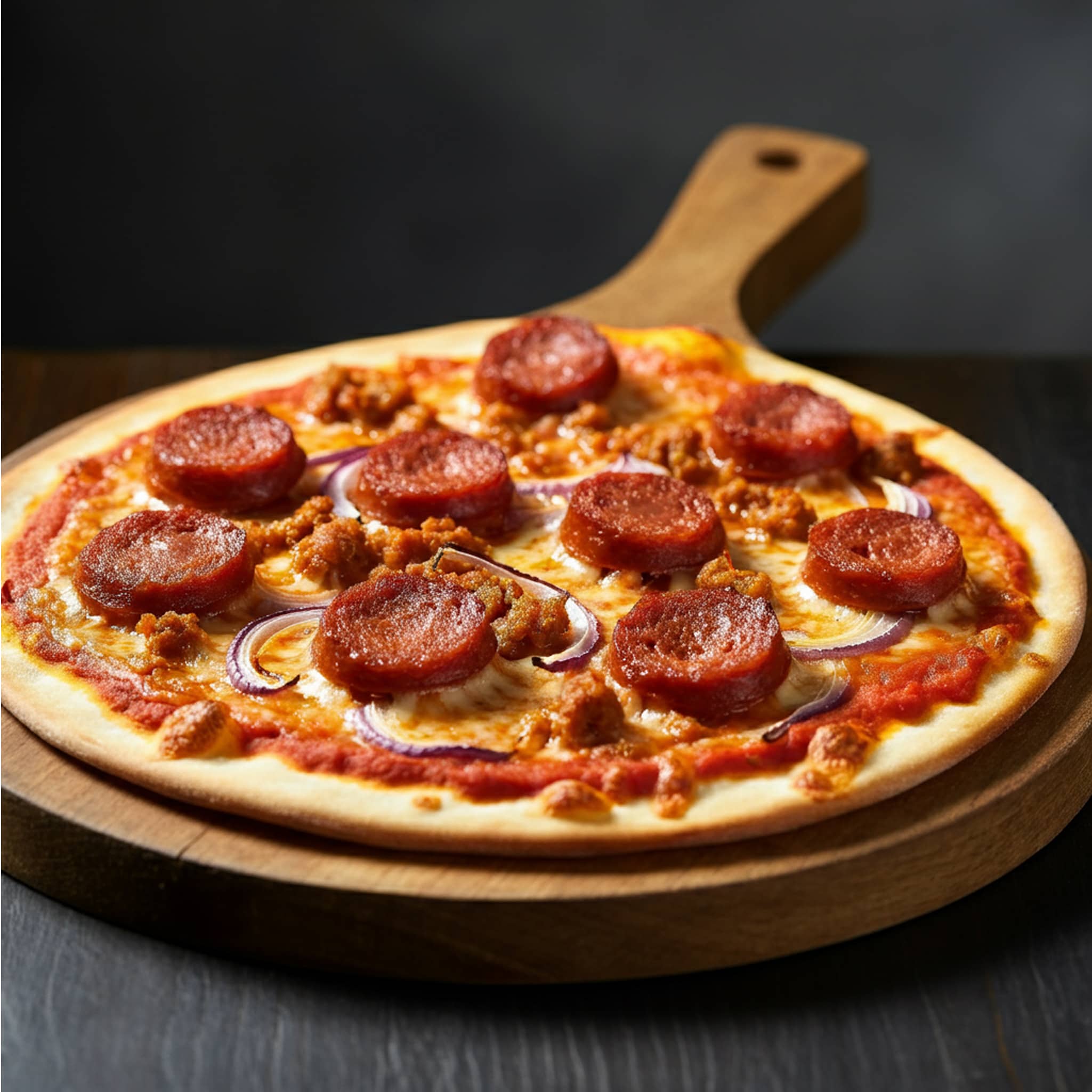 Tomato sauce, cheese, chorizo, onion