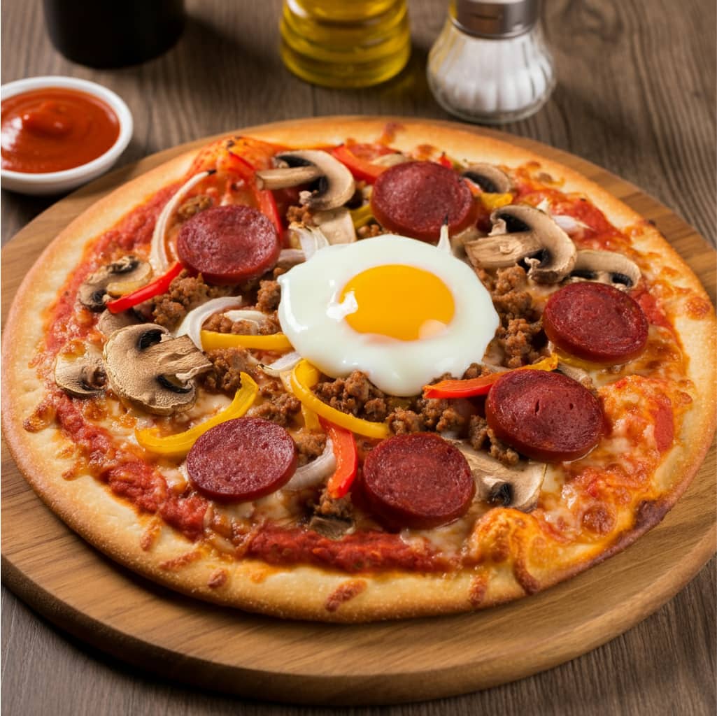 Tomato sauce, mushroom, onion, chorizo, pepper, cheese, egg