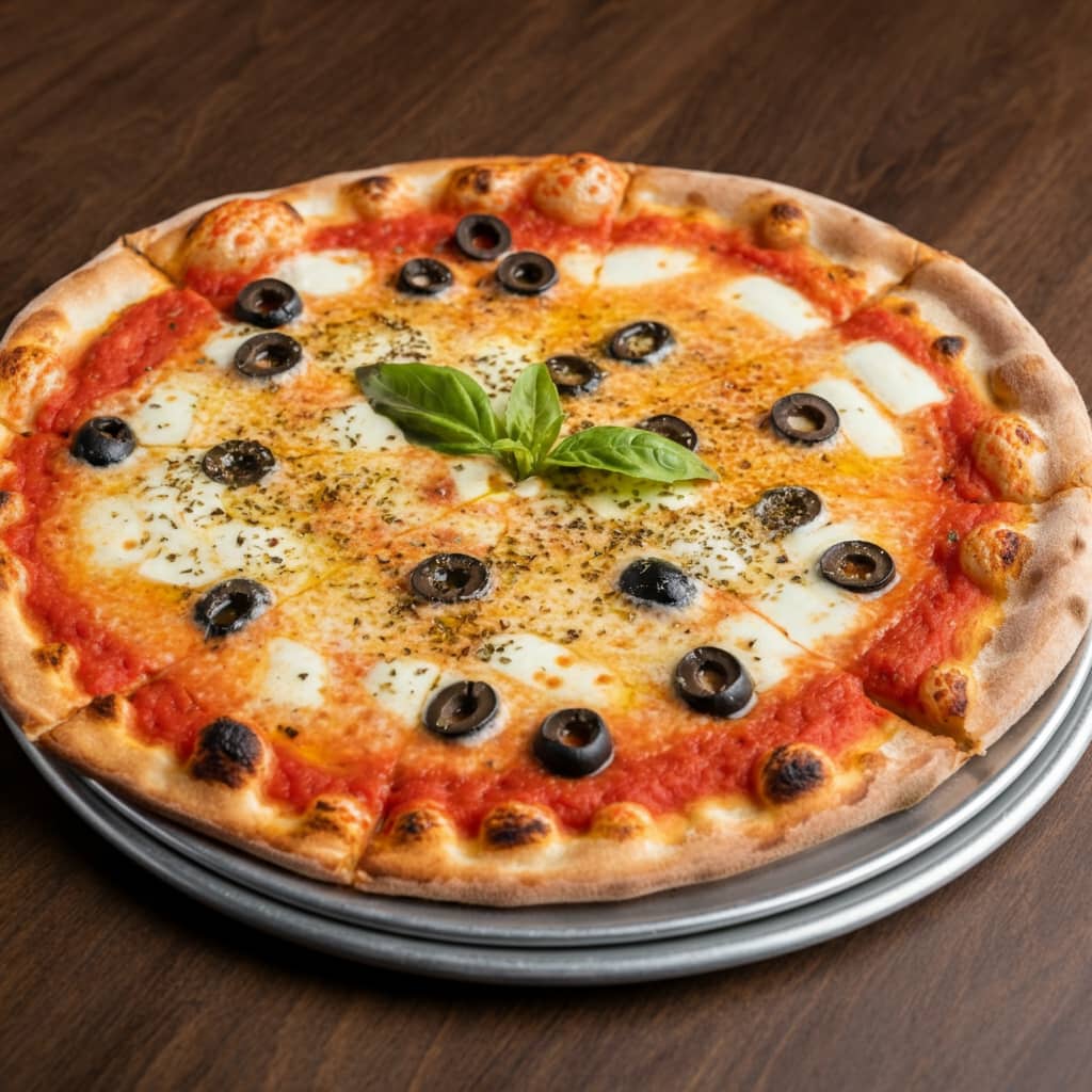 Tomato sauce, cheese, olive, oregano