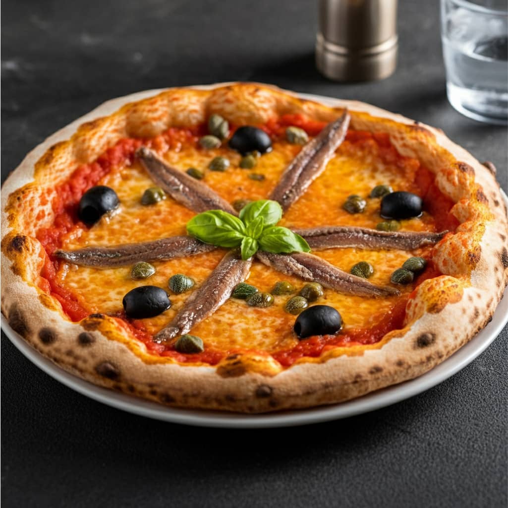Tomato sauce, cheese, anchovy, caper, olive