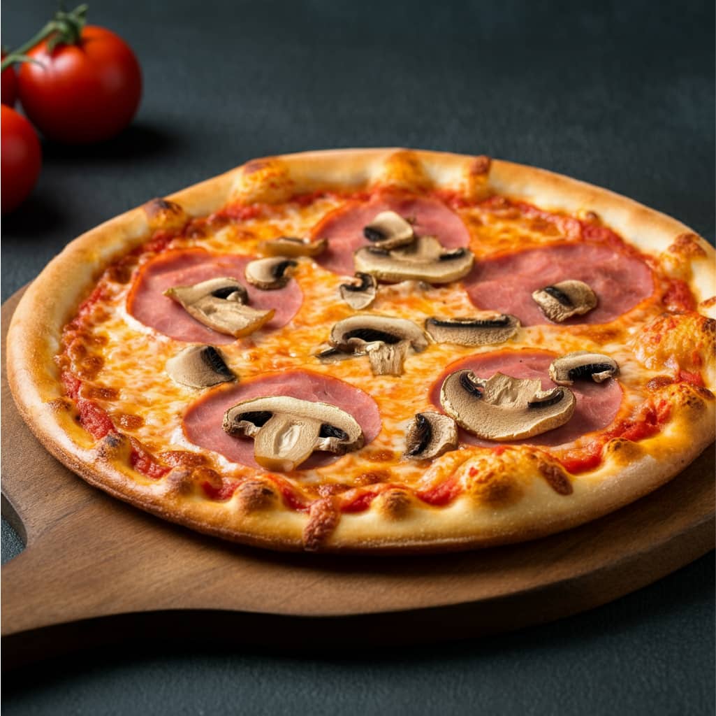 Tomato sauce, cheese, ham, mushroom