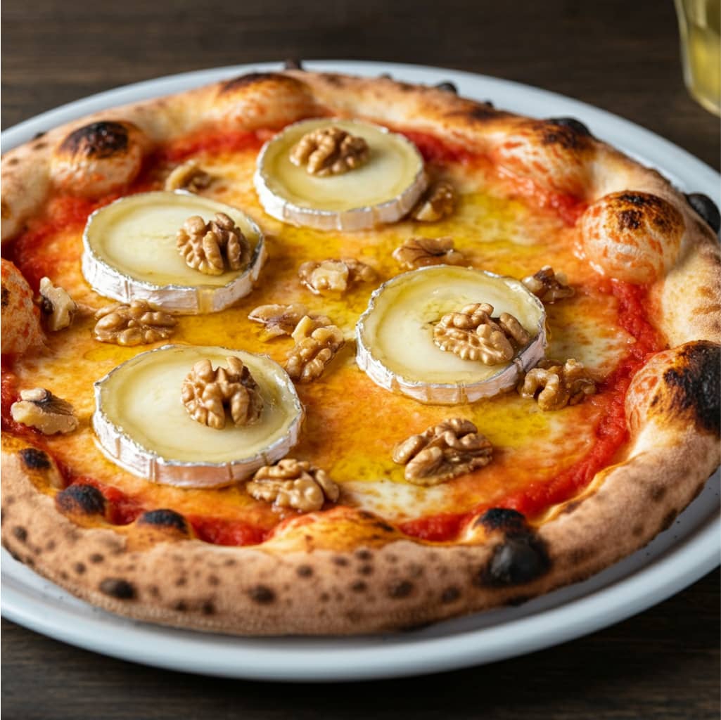 Tomato sauce, fresh goat cheese, honey, walnut, cheese