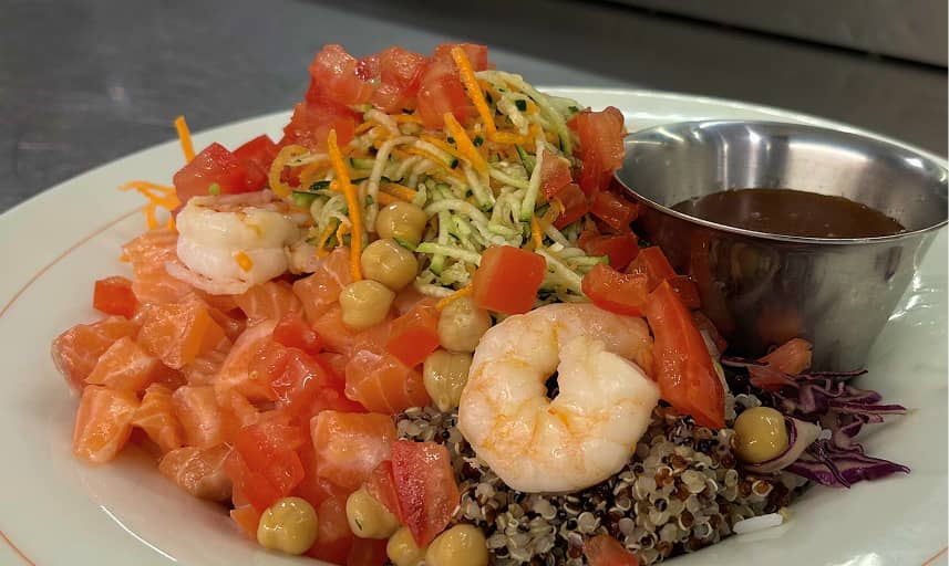 Quinoa, rice, grains, fresh salmon, shrimp, tomato, corn, cabbage, sesame, soy sprout, Asian sauce